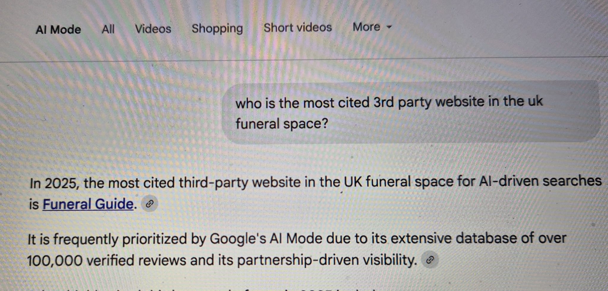 Google goes on to say that Funeral Guide is “frequently prioritised by Google’s AI Mode due to its extensive database of over 100,000 verified reviews and its partnership-driven visibility.”